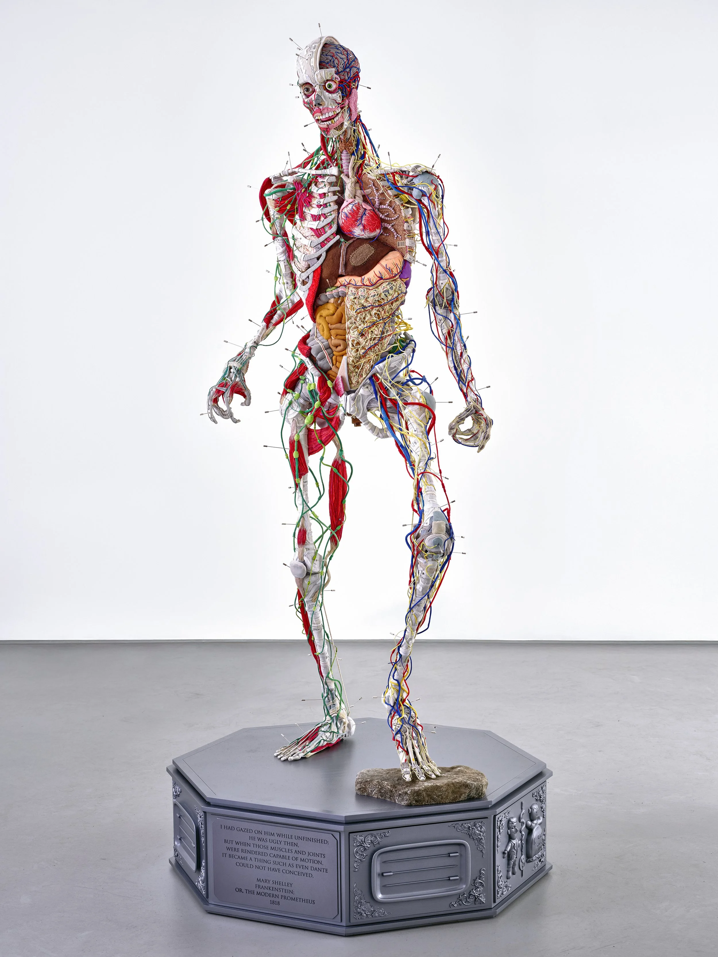 Mixed media; anatomical model made from hundreds of repurposed Frankenstein monster toys, plush toy product tags, pins marking plush toy sources
